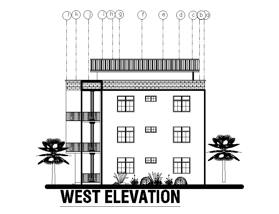 West side elevation of 23x14m apartment plan is given in this Autocad drawing file.Download now.