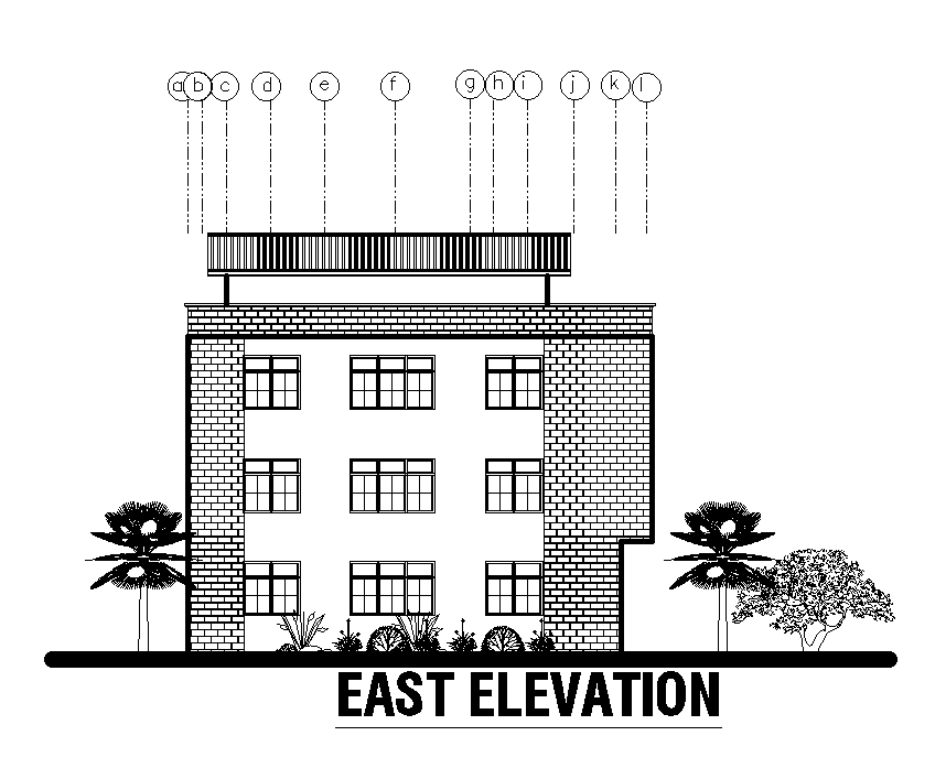 East side elevation of 23x14m apartment plan is given in this Autocad drawing file.Download now.