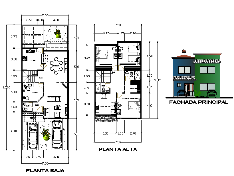 Duplex House Detail. Ground floor Lay-out detail & First Floor lay-out detail, with elevation design.