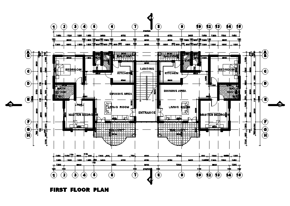 25x13m First Floor Layout of Twin House in CAD Drawing File