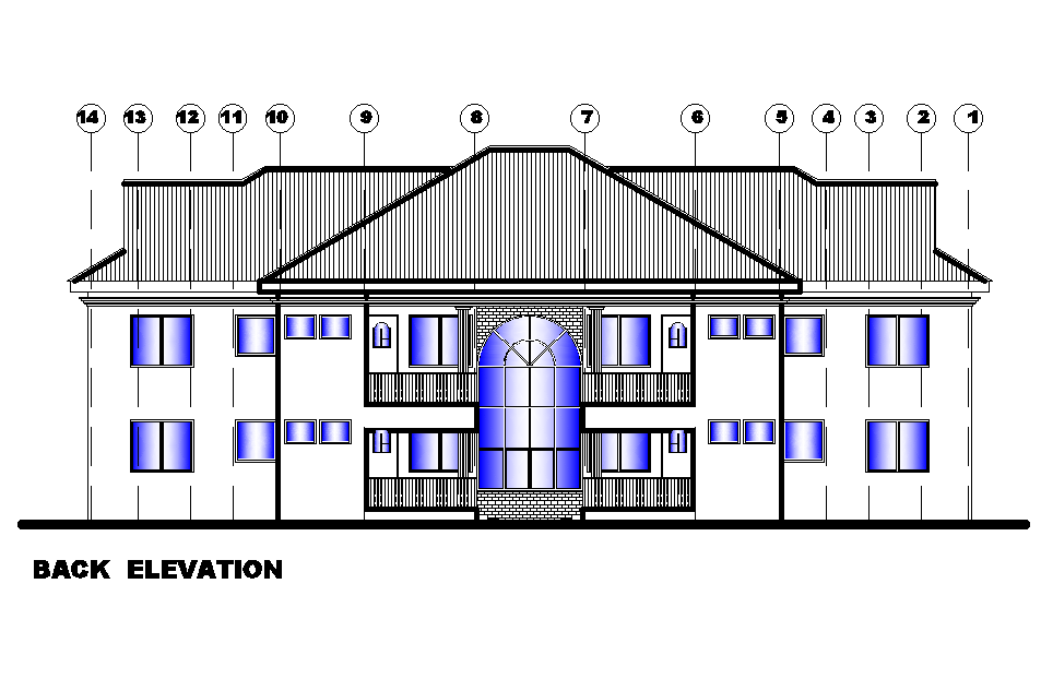 Back elevation of 25x13m twin house plan is given in this Autocad drawing file. Download now.