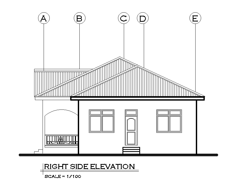 Right side elevation of 20x11m twin house plan is given in this Autocad drawing file. This is single story house plan. Roof material details are given in this drawing. This plan consists of living area, kitchen, master bedroom, kid’s room, common water closet, porch, corridor, and common bathroom are available in the first floor. For more details download the Autocad drawing file. Thank you for downloading the Autocad drawing file and other CAD program files from our website.