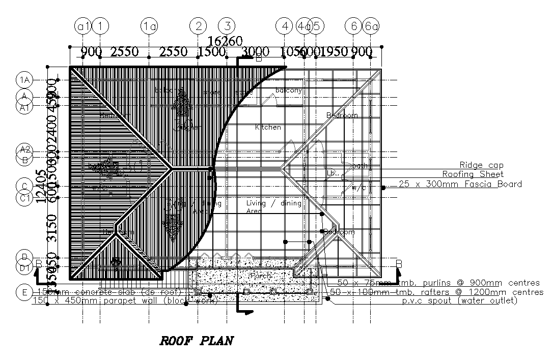 Roof plan of 16x13m house plan is given in this Autocad drawing file. Download now.