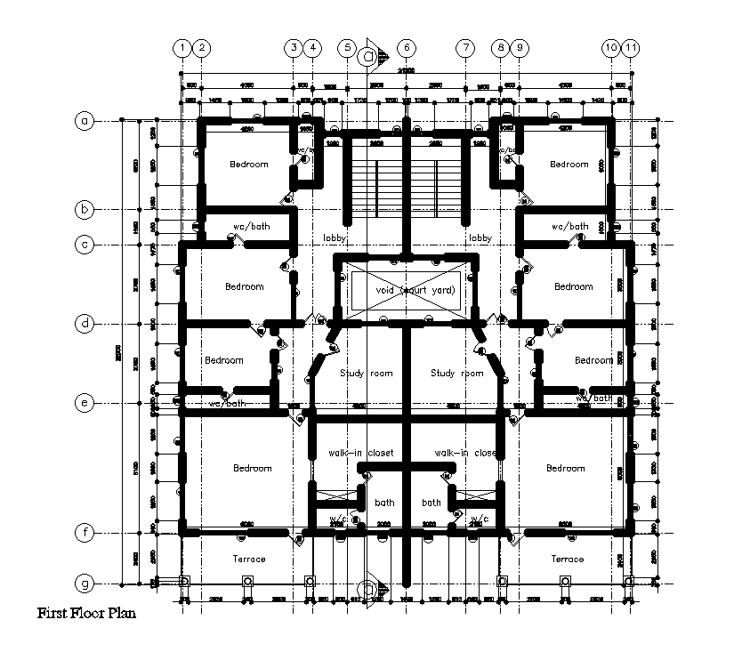 22x22m first floor house plan is given in this Autocad drawing file. This is G+1 house plan. In each floor two houses are available. In the first floor, terraces, master bedroom with attached toilet, study room, guest room with attached bathroom, two kid’s room with attached bathrooms are available. For more details download the Autocad drawing file. Thank you for downloading the Autocad drawing file and other CAD program files from our website.