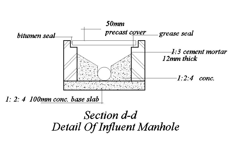 A section view of influent manhole is given in this Autocad drawing file. This manhole is given for the 18x14m house plan. 1:3 cement mortar with 12mm thickness, 50mm precast cover, grease seal, bitumen seal, and other details are given in this drawing model. For more details download the Autocad drawing file. Thank you for downloading the Autocad drawing file and other CAD program files from our website.