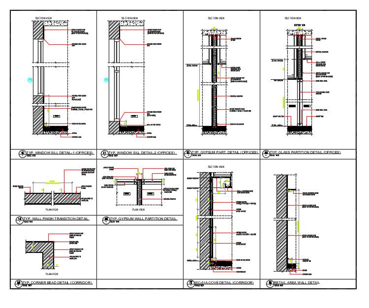 Typical Wall section autocad drawing which consists drywall, glass partition, wooden panelling. This detailed drawing can be used for the Joinery shop drawing with sample specifications included in dwg file.