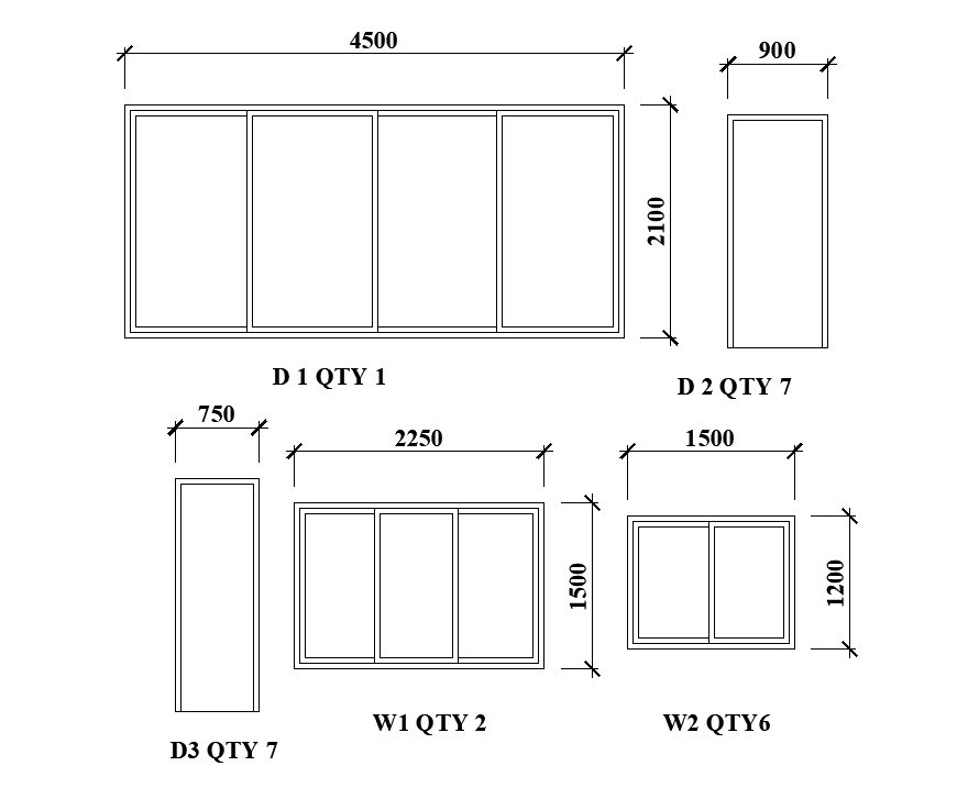 4500x2100mm windows and door plan are given for 10x15m house plan in this Autocad drawing file. Download now.