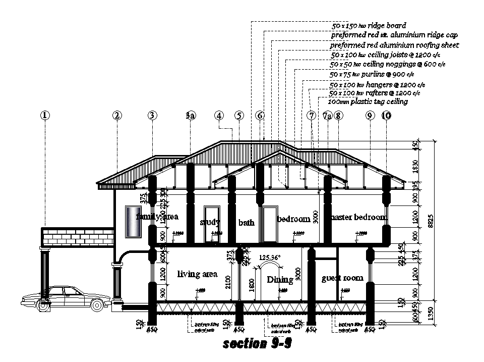 A section view of 8x19m house plan is given in this Autocad drawing file. The total height of the building is 8.9m. This is G+1 house plan. This ground floor consists of car port, terrace, back place, living area, dining hall, store room, kitchen corridor and master bedroom with attached toilet. This first floor consists of corridor, study room, kid’s bedroom with attached bathroom, terrace, family area, guest room with attached toilet, and master bedroom with attached toilet. For more details download the Autocad file. Thank you for downloading the AutoCAD drawing file and other CAD program files from our website.
