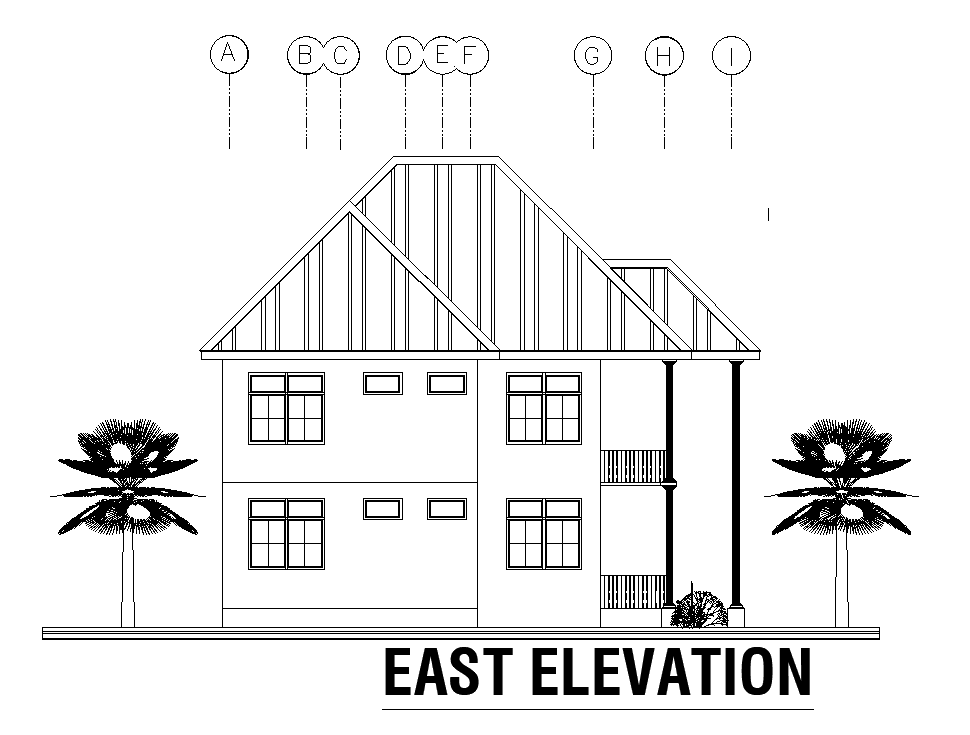 East side elevation of 9x12m residential plan is given in this Autocad drawing file. Download now.