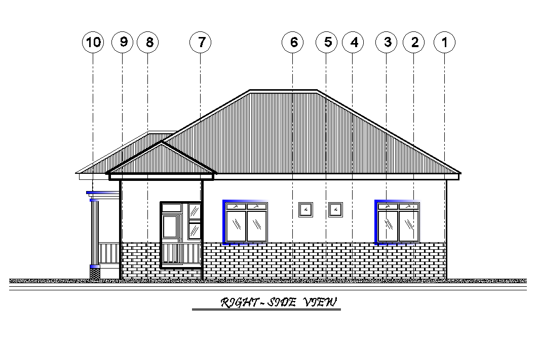 Right side view of 12x14m house plan is given in this Autocad drawing file. Total height of the building is 7.75m. This is single story residential building. Living area, dining area, terrace, kitchen, corridor, porch, master bedroom with attached toilet, kid’s room, guest room, utility area and common toilet are available. For more details download the Autocad file. Thank you for downloading the AutoCAD drawing file and other CAD program files from our website.