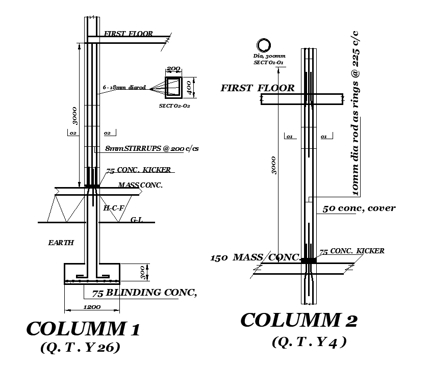 Column detail is given for 15x21m house plan in this Autocad drawing file. There are two types of columns given. Mass concrete, blinding concrete, stirrups details, reinforcement details and first floor levels are mentioned in this drawing. For more details download the Autocad file. Thank you for downloading the AutoCAD drawing file and other CAD program files from our website.