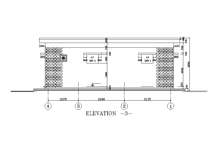 Back elevation of the brick work of guard room building is given in this Autocad drawing file. The height of the building is 3.6m. Door, windows, and measurement details are given in this drawing model. For more details download the Autocad drawing file. Thank you for downloading the Autocad drawing file and other CAD program files.