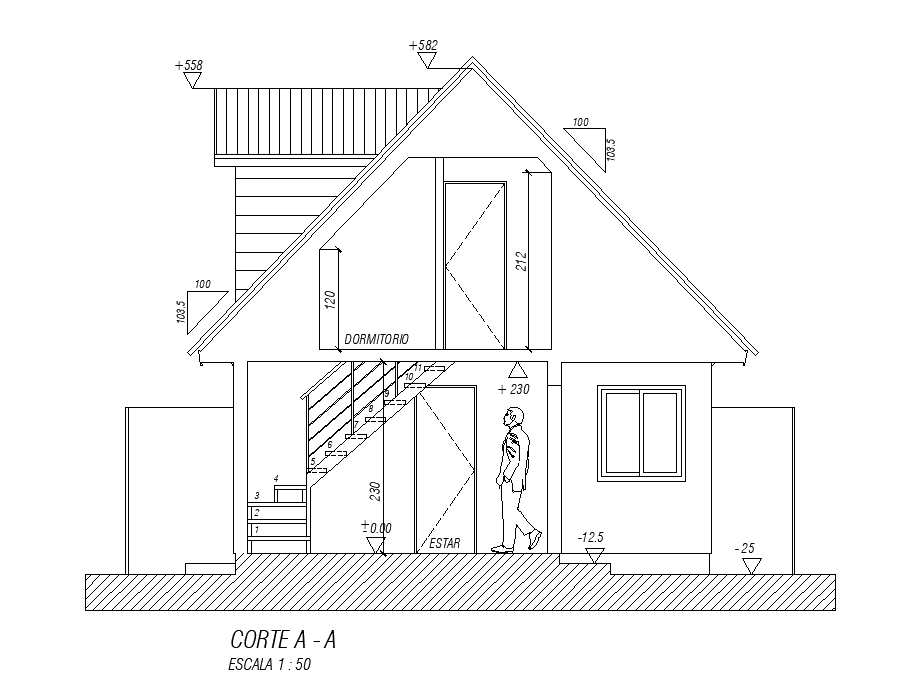 Front section view of 6x9m architecture house plan is given in this Autocad drawing file. This is G+1 house building. In this ground floor plan car parking, access area, estar, dining area, kitchen, master bedroom and common toilet is available. In this plan living area, kid’s room, master bedroom and common toilet is available. For more details download the Autocad drawing file. Thank you for downloading the Autocad drawing file and other CAD program files.