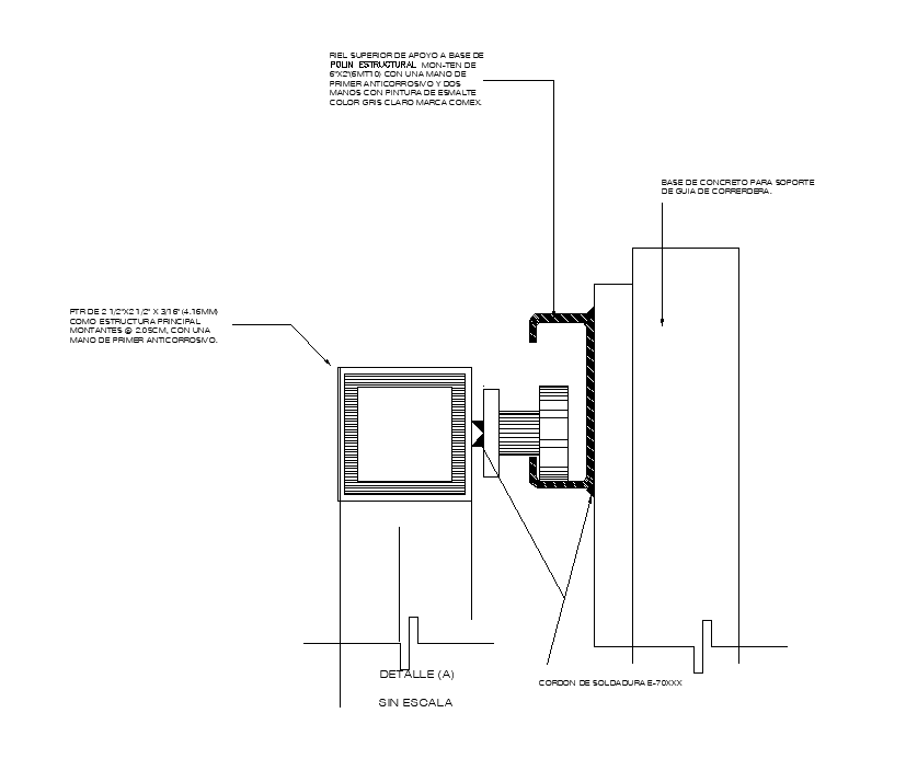 Welding cord detail drawing is given in this Autocad drawing file. Concrete base for support of runner guide is specified. Upper support rail based on structural polyon monten 6 "x2" (6mt10) with one coat of anticorrosive primer and two coats with comex brand light gray enamel paint. 2 1/2 "x2 1/2" x 3/16 "(4.16mm) ptr as main structure uprights @ 2.05cm, with one hand of anticorrosive primer and other details are given. For more details download the autocad drawing file. Thank you for downloading the autocad drawing file and other cad program files.
