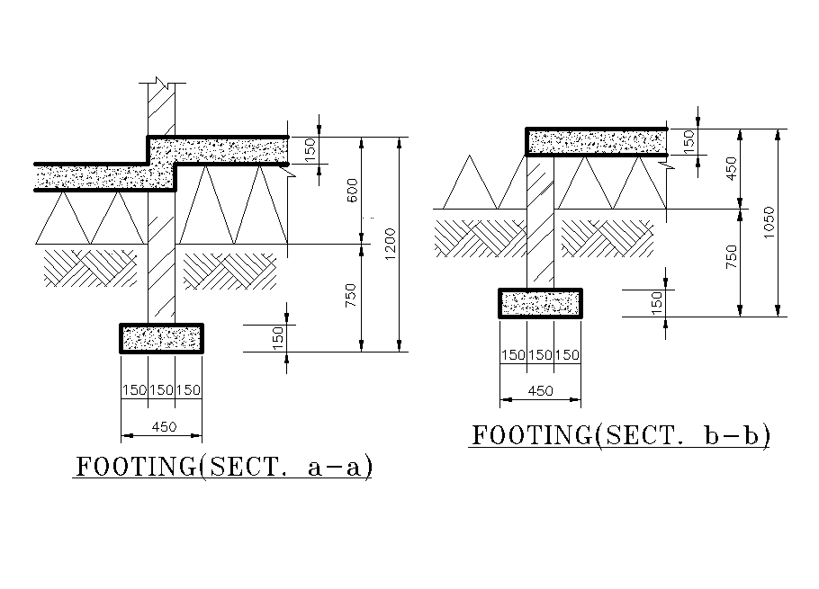Footing section view is given for 9x11m house plan in this Autocad drawing file. The dimension of column is 450x150mm. The height of the footing is 1.2m from the ground level. For more details download the Autocad drawing file. Thank you for downloading the Autocad drawing file and other CAD program files from our website.
