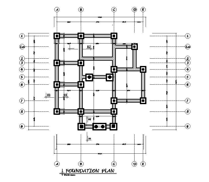 Foundation layout of 12x13m ground floor house plan is given in this Autocad drawing file. Download now.
