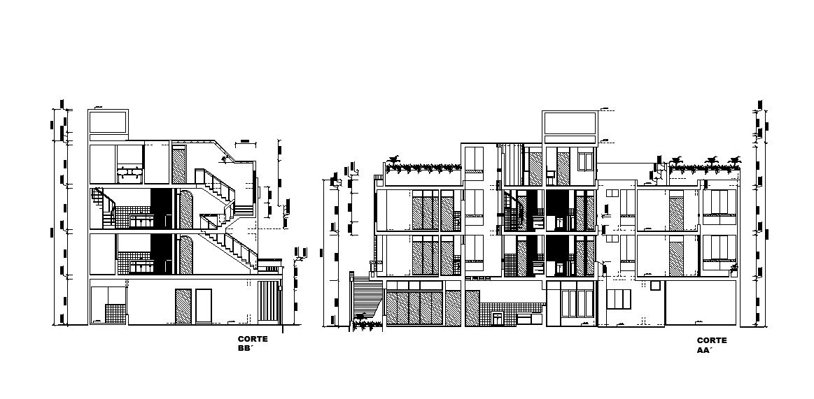 Section view of 12x23m residential plan is given in this Autocad drawing file. This is G+1 house building. In each floor two houses are available. These plans consists of kitchen, dining area, living area, study room, patio services, common toilet, master bedroom with attached bathroom, kid’s room and guest room is available. For more details download the Autocad DWG drawing file. Thank you for downloading the Autocad drawing file and other CAD program files from our website.