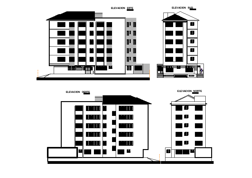 An elevation of 36x15m apartment building is given in this Autocad drawing file. Download now.