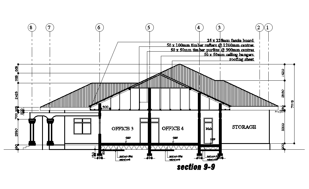 Back section view of 24x25m office plan is given in this Autocad drawing file. Download now.
