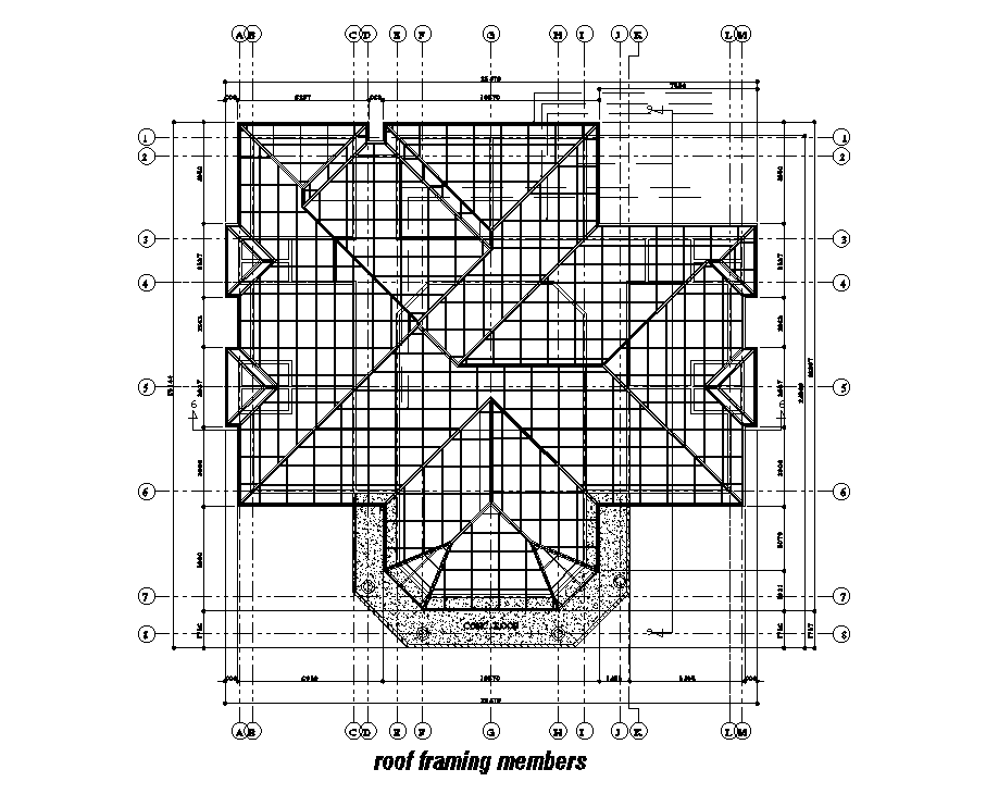 Roof framing members of 24x25m office plan is given in this Autocad drawing file.Download now.