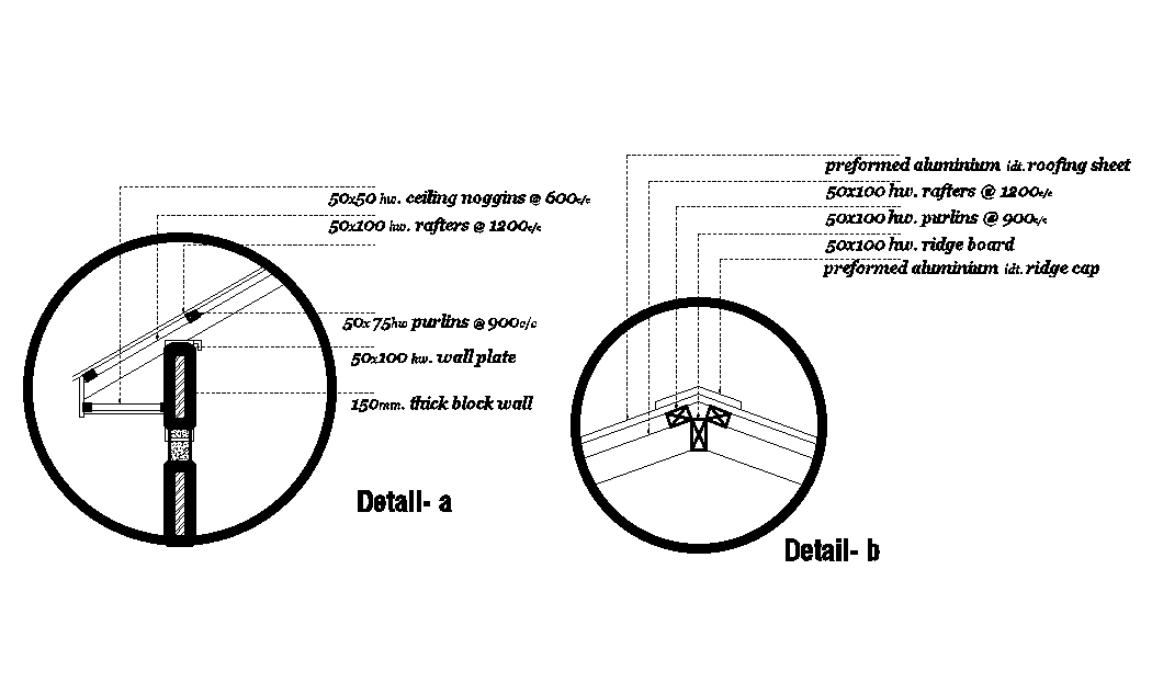 Enlarged roof connection details are available in this Autocad drawing file. Two detail drawings are given in this Autocad file. 50x50mm ceiling noggins, 50x75mm purlins, 150mm thickness of block wall, 50x100mm wall plate and other details are given in this drawing model. For more details download the Autocad drawing file. Thank you for downloading the Autocad drawing file and other CAD program files from our website.