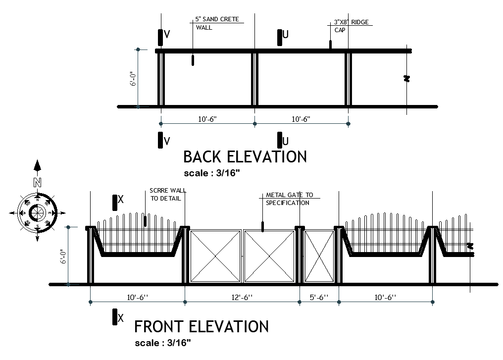 Back elevation of fence wall is given in this Autocad drawing file. Download now.