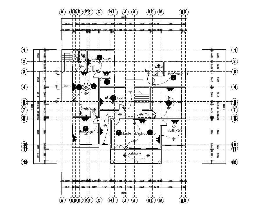 Electrical layout of 18x17m first floor house plan is given in this Autocad drawing file. Download now.