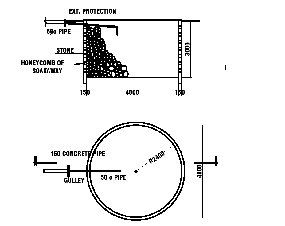 Top view of 18x17m house plan of septic tank plan is given in this Autocad drawing file. The height of septic tank is 3m. External protection, 50mm diameter pipe, stone, honeycomb of soak way, concrete pipe, gulley and other details are given in this drawing file. For more details download the Autocad drawing file. Thank you for downloading the Autocad drawing file and other CAD program files from our website.
