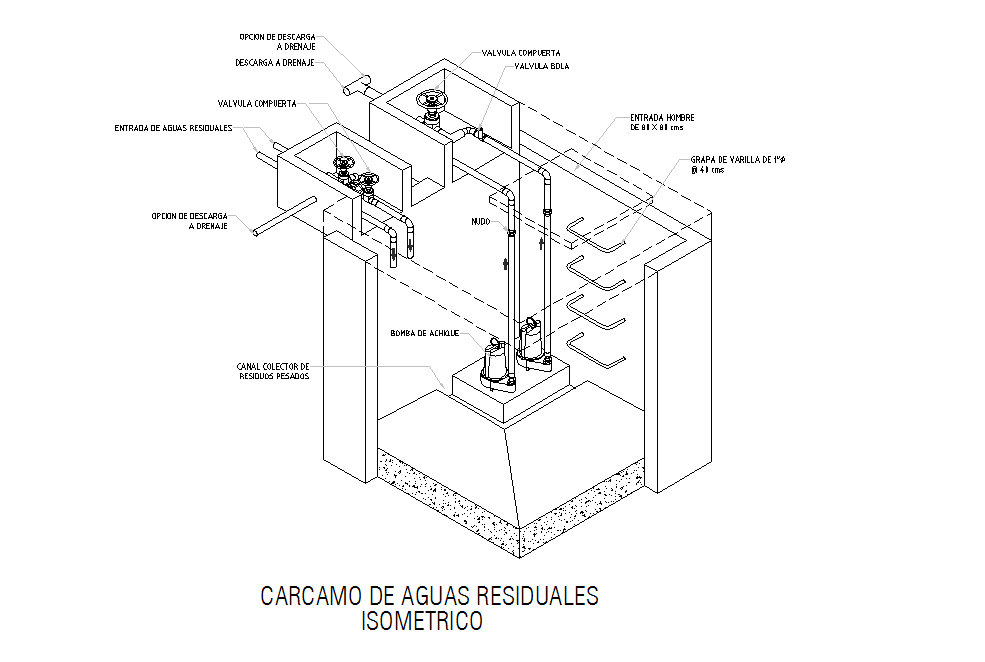 Wastewater Treatment plant design in DWG file, 1 "rod clip @ 40 cms , gate valve, Download option To drainage, Wastewater inlet , Channel collector Heavy residues.