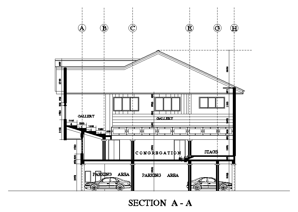 Left side section view of 32x16m ground floor church plan is given in this Autocad drawing file. This is G+2 church building. In this ground floor car parking, common water closet for male & female, equipment store, tool store and other details are given. In the first floor part of main auditorium, stage, band, drummer, meeting room, office room, common area, account room, pastor’s office, vestry and duct opening is available. In the second floor, stage, band, drummer, counseling room, gallery, and void is available. For more details download the Autocad drawing file. Thank you for downloading the Autocad drawing file and other CAD program files from our website.