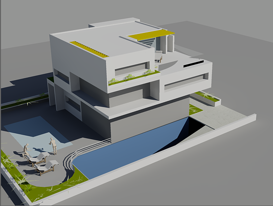 The 3D Modern Bungalow AutoCAD Drawing presents a contemporary architectural design with a visually stunning rendered exterior view. The design showcases a luxurious residential structure featuring a swimming pool, open terrace, and landscaped garden areas. With its clean geometric lines and balanced proportions, this drawing provides a perfect example of modern residential architecture. The 3D model highlights essential elements such as balcony extensions, shaded spaces, outdoor furniture placement, and driveway access, helping architects visualize the spatial flow efficiently.