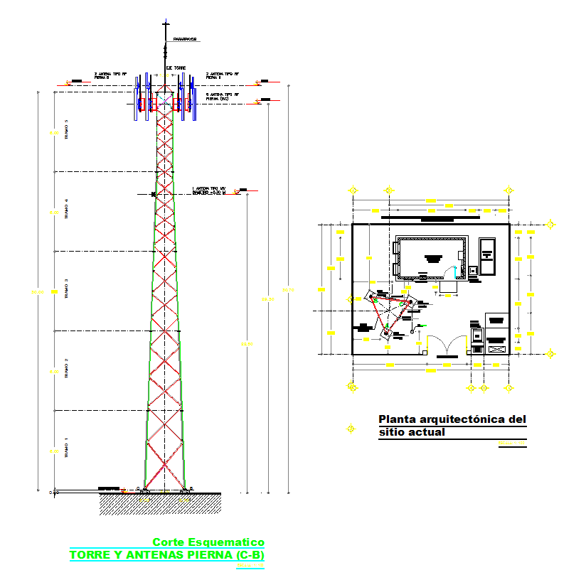 2 rf type antenna Leg b, 6 rf type antenna Leg (b, c), lighting rode, Architectural plan of the current site, Schematic cut Tower and antenna leg