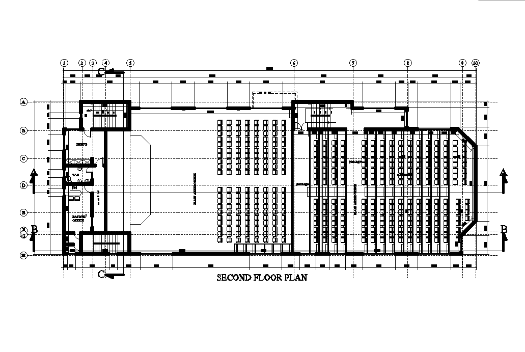 45x18m second floor church plan is given in this Autocad drawing file. This is G+2 church building. In the second floor part of main auditorium, stage, office room, band, main part 1 church auditorium, and one more stage is available. For more details download the Autocad drawing file. Thank you for downloading the Autocad drawing file and other CAD program files from our website.