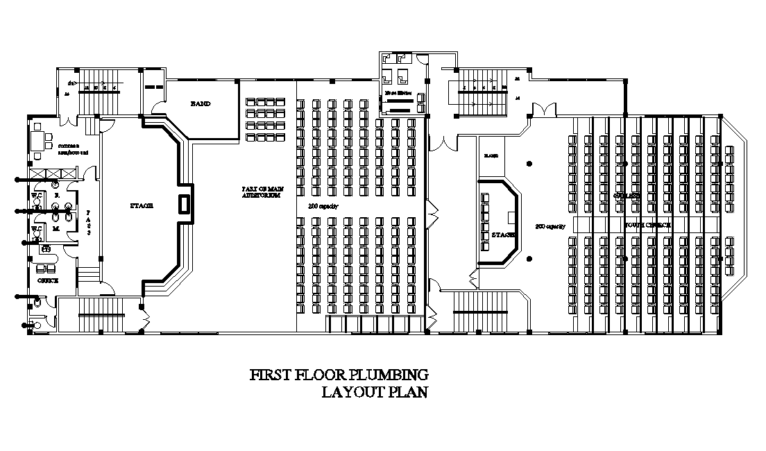 First floor plumbing layout of 45x18m church plan is given in this Autocad drawing file. This is G+2 church building. In the first floor part of main auditorium, stage, office room, common area, account room, band, youth church auditorium, youth church stage is available. For more details download the Autocad drawing file. Thank you for downloading the Autocad drawing file and other CAD program files from our website.