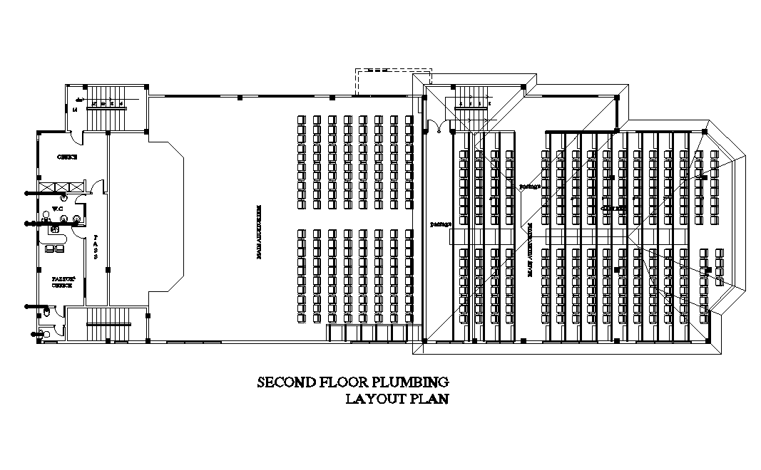 Second floor plumbing layout of 45x18m church plan is given in this Autocad drawing file. This is G+2 church building. In the second floor part of main auditorium, stage, office room, band, main part 1 church auditorium, and one more stage is available. For more details download the Autocad drawing file. Thank you for downloading the Autocad drawing file and other CAD program files from our website.
