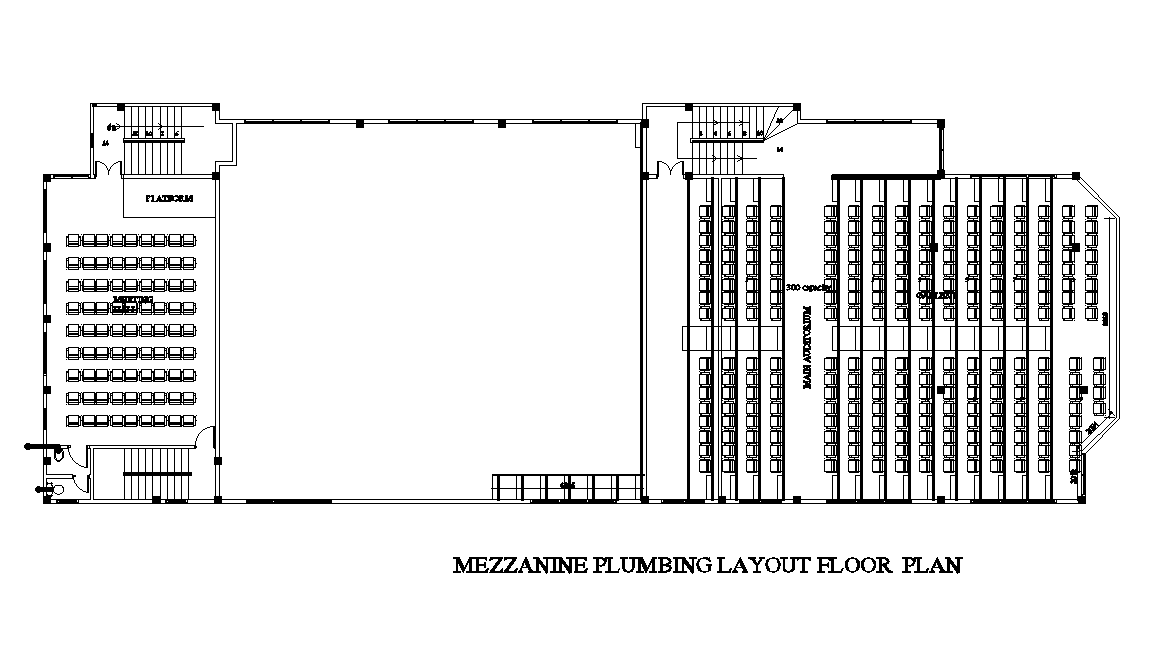 Mezzanine plumbing layout of 45x18m church plan is given in this Autocad drawing file.Download now.
