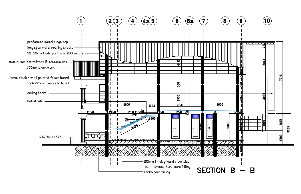 Front section view of 22x20m house plan is given in this Autocad drawing file. This is G+1 house building. In the ground floor sitting area, living area, master bedroom with attached toilet, guest room with attached bathroom, study room, kid’s room with attached toilet, kitchen, dining area, corridor, and storage is available. In the first floor sitting area, master bedroom with attached toilet, hand rail, and terrace is available. For more details download the Autocad drawing file. Thank you for downloading the Autocad drawing file and other CAD program files from our website.