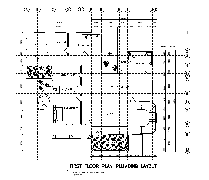 Plumbing layout of 22x20m first floor house plan is given in this Autocad drawing file. Download now.