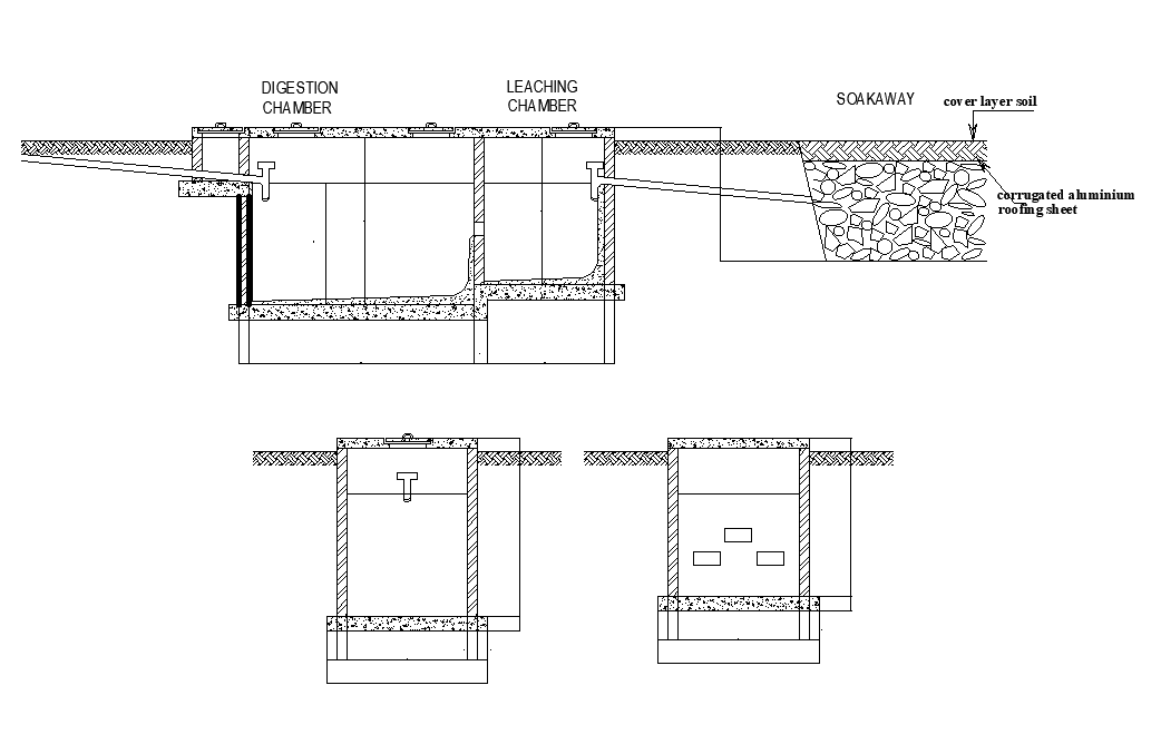 Digestion chamber of 22x20m house plan toilet is given in this Autocad drawing file. Leaching chamber detail is given in this drawing. Inspection chambers, 100mm pvc main soil pipe to septic tank, shallow seal trap, gully trap, and other details are given in this drawing model. For more details download the Autocad drawing file. Thank you for downloading the Autocad drawing file and other CAD program files from our website.