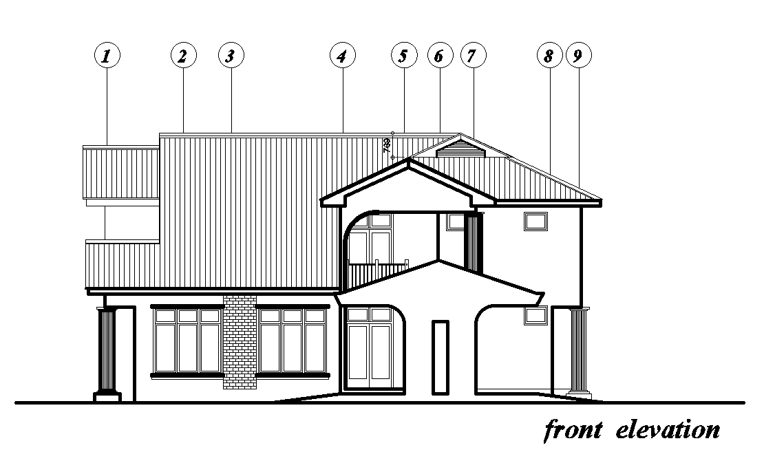 Front side elevation of Luxury villa plan is given in this Autocad drawing file. Download now.
