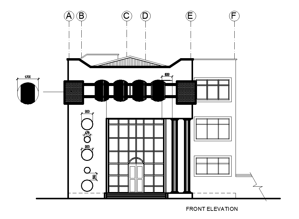 Front elevation of office building is given in this Autocad drawing file. Download now.