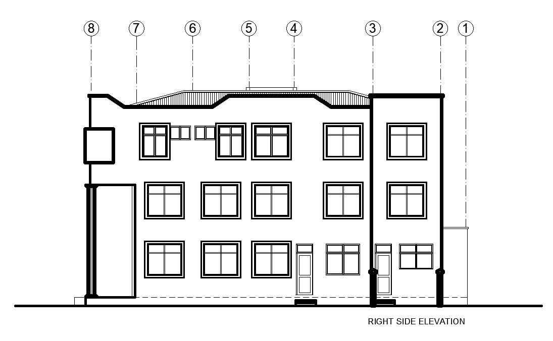 Right side elevation of office building is given in this Autocad drawing file. Download now.