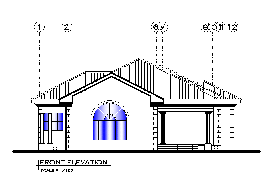 Front elevation of 15x17m house plan is given in this Autocad drawing file. Download now.