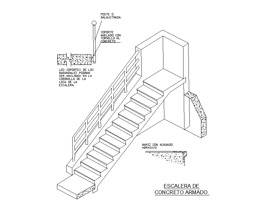 Armored concrete ladder is given in this AutoCAD drawing file. Railing detail is given this drawing. Los soportes de los barandales podran ser anclados en la coronilla de la losa de la escalera and other details are mentioned in this drawing model. For more details download the autocad drawing file. Thank you for downloading the autocad file and other cad program files from our website.