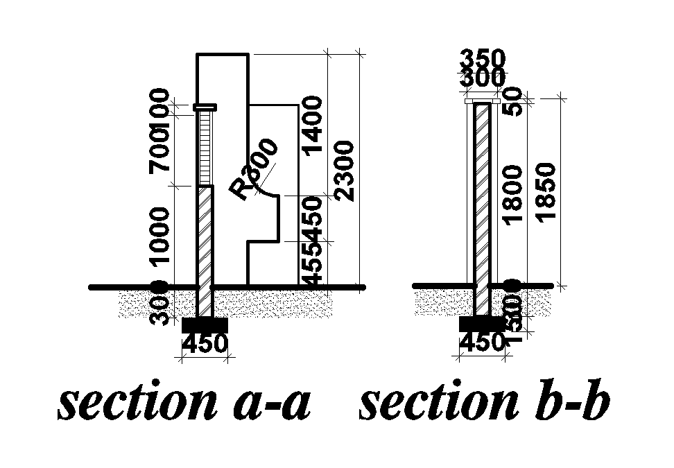 Two footing section details are given in this Autocad DWG drawing file. The length of the footing is 450mm. The height of the footing 1 & 2 is 2.3m and 1.85m respectively. For more details download the Autocad drawing file. Thank you for downloading the Autocad drawing file and other CAD program files from our website.
