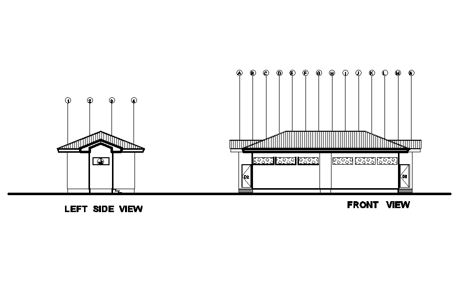 Left side elevation of 6x6m ground floor plan of security lounge is given in this Autocad drawing file.Download now.