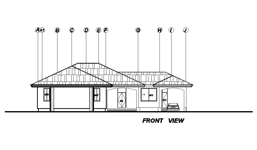 Front elevation of 20x19m house plan is given in this Autocad drawing file. Download now.