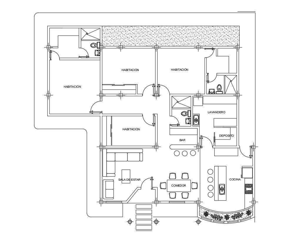 the single story house ground floor plan cad drawing which includes master bedroom, kitchen, store room, dining area, common toilet, living area, circulation area, and garden is available. For more details download the Autocad drawing file. Thank you for downloading the Autocad drawing file and other CAD program files from our website.