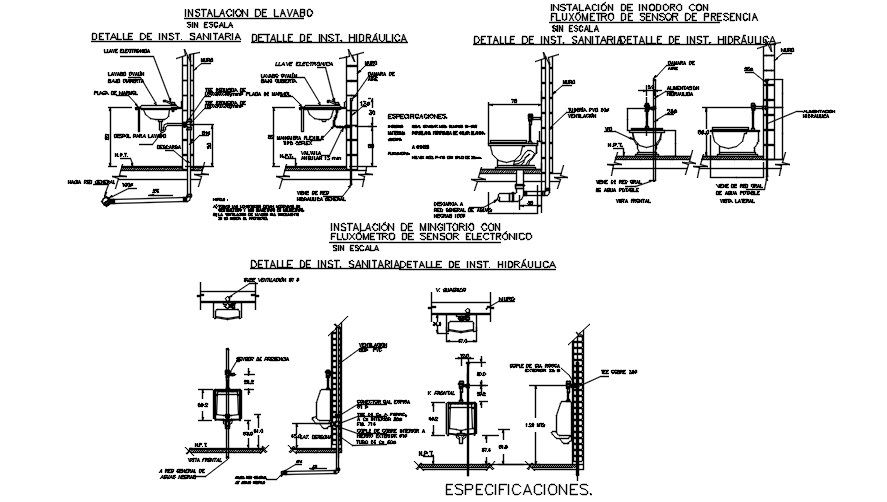 The sanitary ware installation sectional elevation design that shows of sink without scale, installation of toilet with presence sensor flush meter, all lengths are dinned in centimetres and diameters in millimetres and lavatory ventilation will only go if the project indicates it. Thank you for downloading the AutoCAD drawing file and other CAD program files from our website.