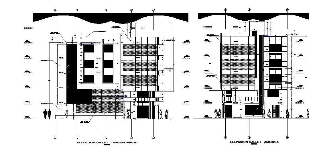 Elevation view of 15x18m hotel cum restaurant plan is given in this Autocad drawing file. Download now.